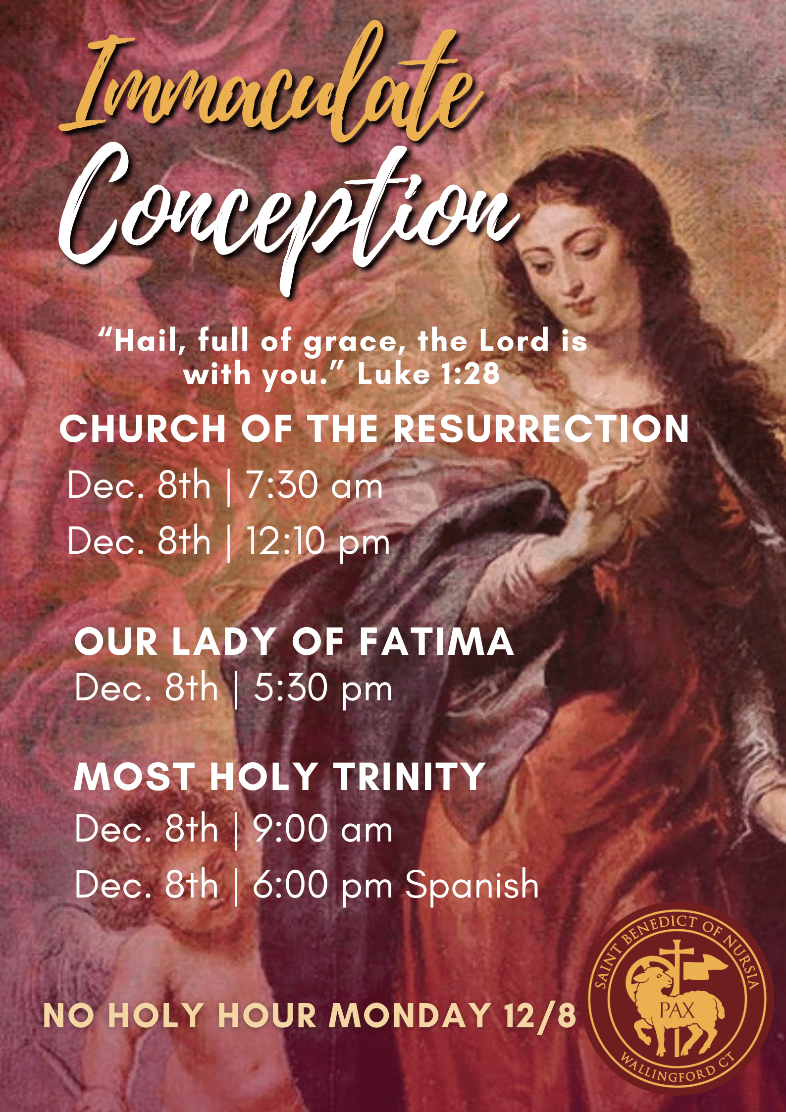 Solemnity of the Immaculate Conception This beautiful holy day invites us to rejoice in the pure and faithful "yes" of our Blessed Mother. Mary's Immaculate Conception reminds us of God's endless grace and His desire to draw each of us closer to His heart. Join us as we honor Our…