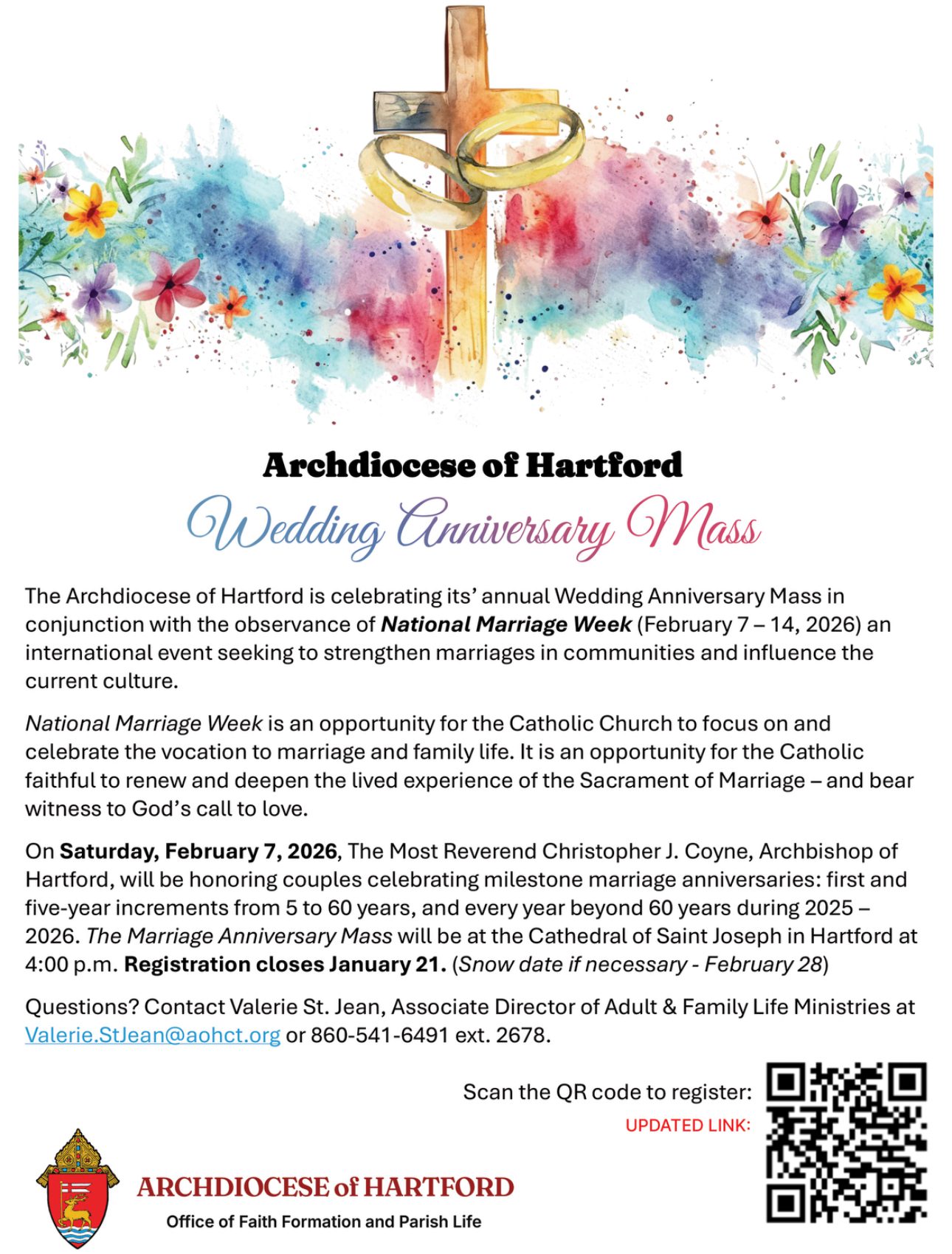 Celebrating the Gift of Marriage During National Marriage Week (February 7–14, 2026), the Archdiocese of Hartford invites couples to celebrate the beautiful vocation of marriage at the Annual Wedding Anniversary Mass. On Saturday, February 7, 2026, at 4:00 PM, Archbishop Christopher J. Coyne will honor couples celebrating milestone anniversaries — 1 year, and every 5-year […]