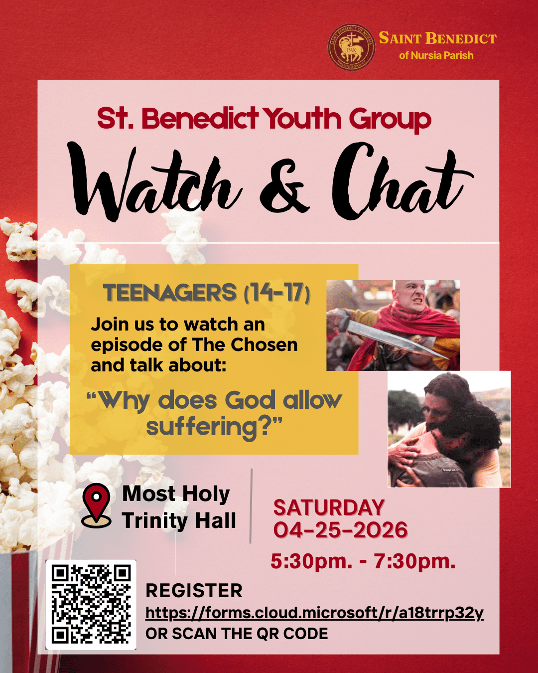 Watch and Chat Night!! Hey Teens (ages 14-17)!! You are invited to a relaxed and meaningful evening where we'll watch and episode from The Chosen and have a real, honest […]