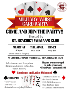 The St. Benedict Women’s Club invites you to a fun-filled Military Card Party, an evening of games, fellowship, and great prizes!